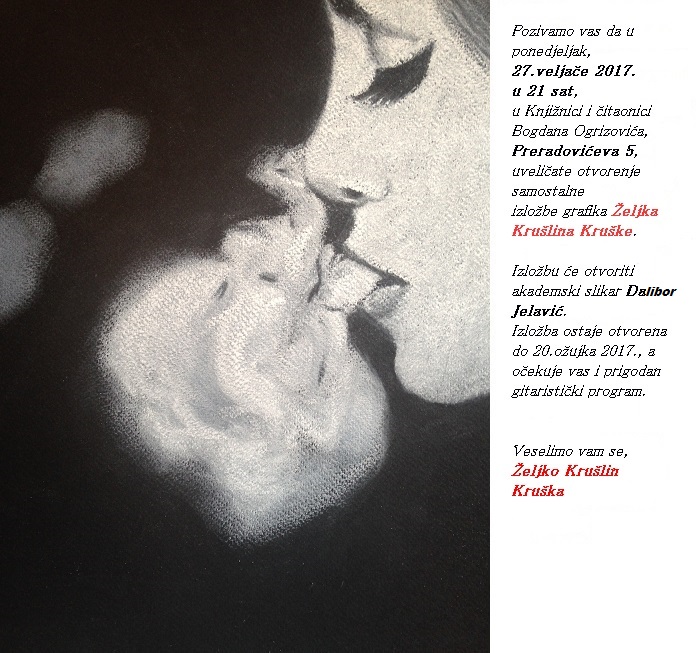 Kako izgleda druga strana stvaralaštva Željka Krušlina Kruške, najbolje da otkrijete sami na samostalnoj izložbi grafika, u ponedjeljak 27.02.2017 u 21:00 sat. Izložbu u Knjižnici i čitaonici Bogdana Ogrizovića, Preradovićeva 5 u Zagrebu, otvorit će akademski slikar Dalibor Jelavić.